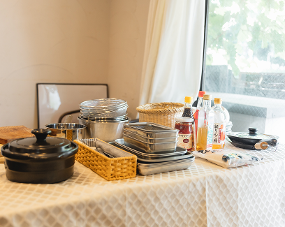 包丁、エプロン、手拭きタオル、筆記用具、クリップボード、タッパー2個、 その月々で各自でご用意をお願いする食材、スリッパです。